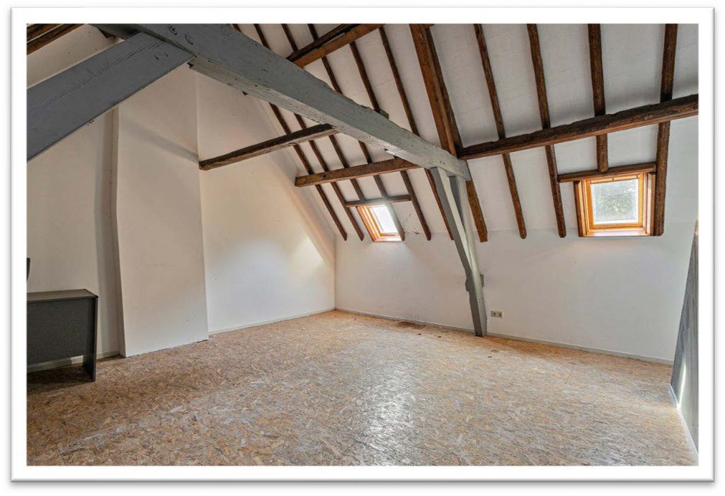 Via de romantische houten trap die zich bevindt achter de kralenplanken wand in de keuken komt u uit op de eerste verdieping en waant u zich terug in de tijd. Onder de eeuwenoude houten spanten en de fraaie dakconstructie bevindt zich een opmerkelijk grote en lichte kamer die te gebruiken is als hobbykamer, slaapkamer, werkkamer of wat u maar wilt. Er is zelfs voldoende ruimte om een tweede badkamer te realiseren als meerwerk-optie, waarbij nog voldoende ruimte over blijft voor de inrichting van een sfeervolle één- of tweepersoons (logeer)kamer.