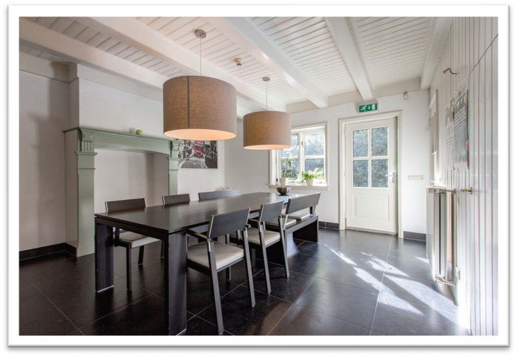 Op de begane grond van het Maagdenhuisje is een ruime woonkeuken gesitueerd, die behalve een keukenblok ook ruimte kan bieden aan een eettafel voor 6 tot 8 personen. De bestaande schouw is eventueel bruikbaar te maken voor het plaatsen van een groot fornuis