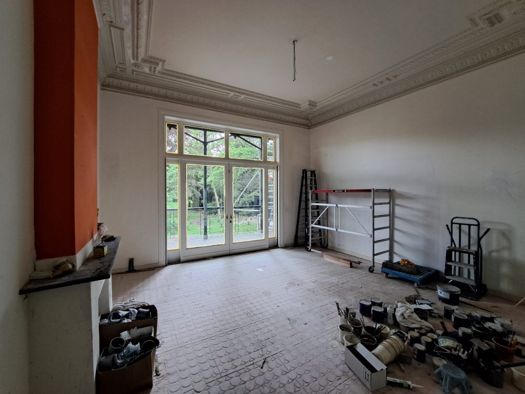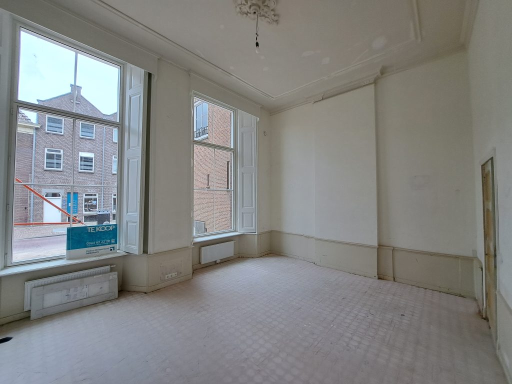 De slaapkamer op de begane grond is zeer stijlvol dankzij de hoge ramen en ornamenten op het plafond. Deze ruimte wordt voorzien van gesloten “achterzet- ramen” die tocht en geluidsoverlast van de straat grotendeels tegen houden; de ruimte wordt mechanisch geventileerd. De vroegere toegangsdeur gaat dienst doen als centrale meterkast en zal aan de zijde van de slaap- kamer geluid- en brandwerend afgewerkt worden en voorzien van een vaste kast.
