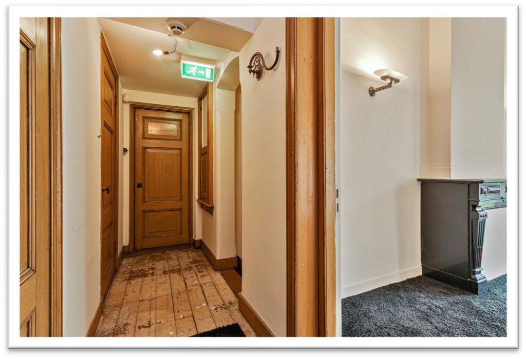 is bereikbaar door middel van 2 originele schuifdeuren met bovenlichten, die de lichtopbrengst en kijk op de prachtig aangelegde stadstuin optimaal maken.